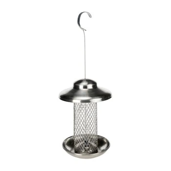 Mit Dach zum Schutz vor Nässe und Auffangschale zum Auffangen von herunterfallendem Futter. Durch die Metallhalterung kann die Futtersäule an beliebiger Stelle aufgehangen werden.