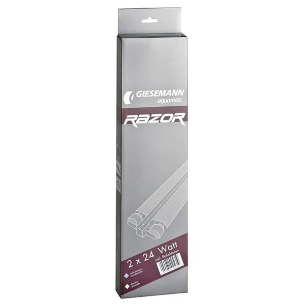 Die RAZOR T5 von Giesemann bringt ein hochwertiges Lampensystem zu Ihnen nach Hause, welches Lichtmodul ebenso wie Reflektoren umfasst. Alle Versionen und Varianten werden auf modernen Produktionsanlagen ausschließlich in Deutschland hergestellt, wo jede einzelne Lampe umfangreichen Qualitätskontrollen unterzogen wird, was für eine gleichbleibend hohe Qualität sorgt. Das Leuchtengehäuse ist kompakt, passt auf jedes Becken und unterstützt eine optimale Ausleuchtung. So befindet sich im oberen Bereich eine integrierte Führungsschiene, in der zwei Edelstahlverbinder eingeschoben und fixiert werden können: So gleicht das System selbständig unterschiedliche Aquarienlängen aus. An diesen Verbindern befinden sich mehrfache Montagemöglichkeiten, wodurch das Modul optimal unter Abdeckungen, an Haltern oder direkt ans Glas befestigt werden kann. Die hochwertige eloxierte Oberfläche sorgt jederzeit für optimale Lichtreflektion und ist unempfindlich gegen selbst aggressives Salzwasser. Die eingebauten elektronischen HF-Vorschaltgeräte sorgen für einen flackerfreien Betrieb mit Sofortstart. In Deutschland umfasst der serienmäßige Lieferumfang zudem spezielle RAZOR Hochglanzreflektoren, welche die Lichtkraft der Leuchtstofflampen nahezu verdoppeln.